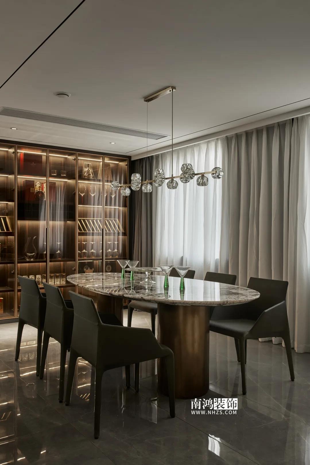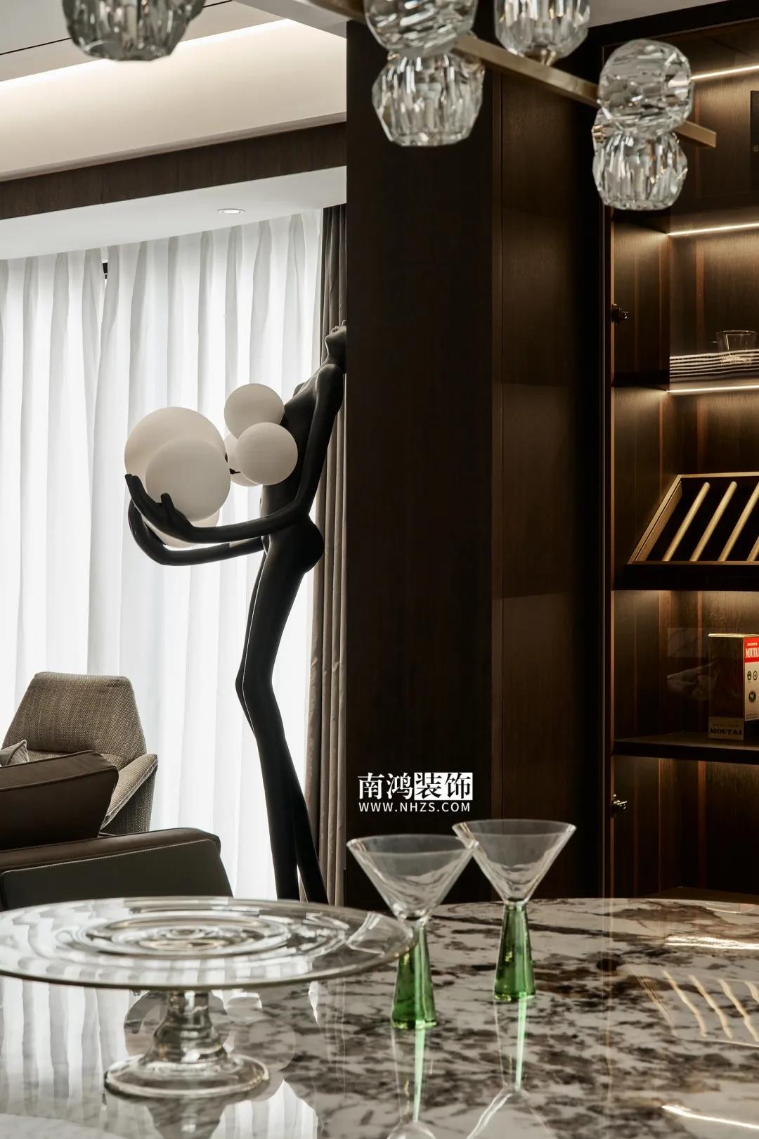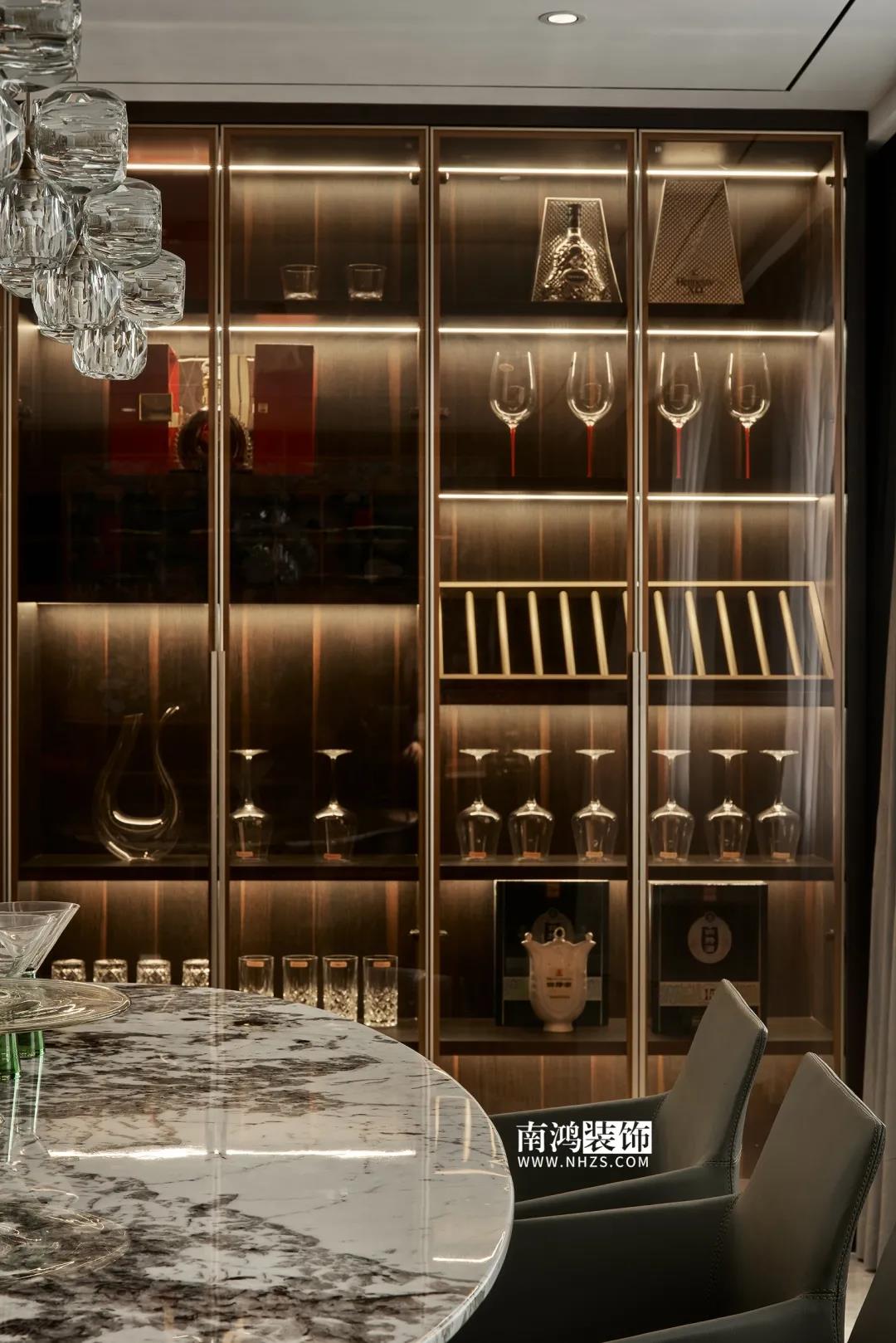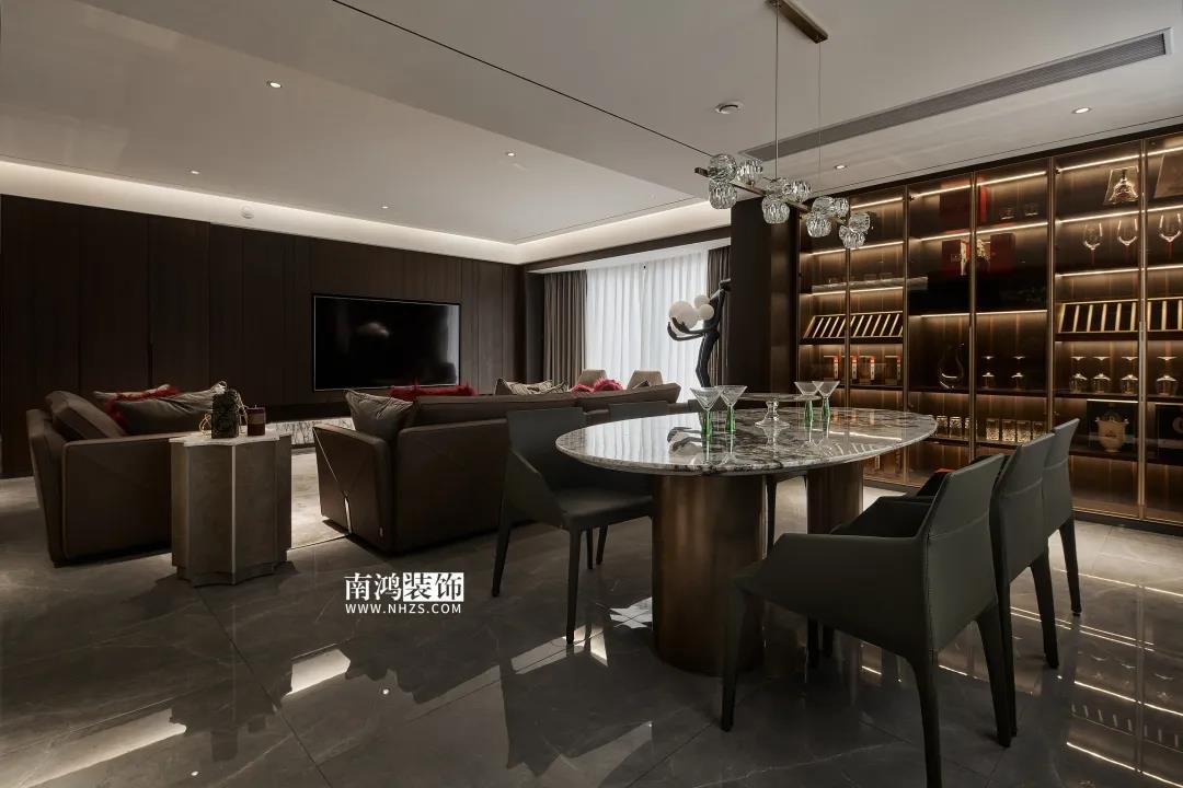 屋主偏愛深色系,因此設(shè)計師精細地調(diào)配深色在空間中的比例,運用護墻板、大理石、皮革等質(zhì)感材質(zhì),借助燈光效果,為他們打造了這個頗具神秘感和高級感的暗色空間。