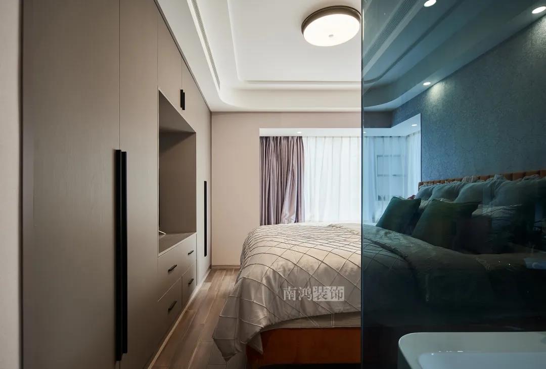 主臥背景墻應屋主的喜好選用了淺色的藝術墻紙,沿窗打造休閑飄窗,床尾則是整排的定制柜體用作日常收納。主衛與睡眠區之間以玻璃相隔,改善了暗衛采光。