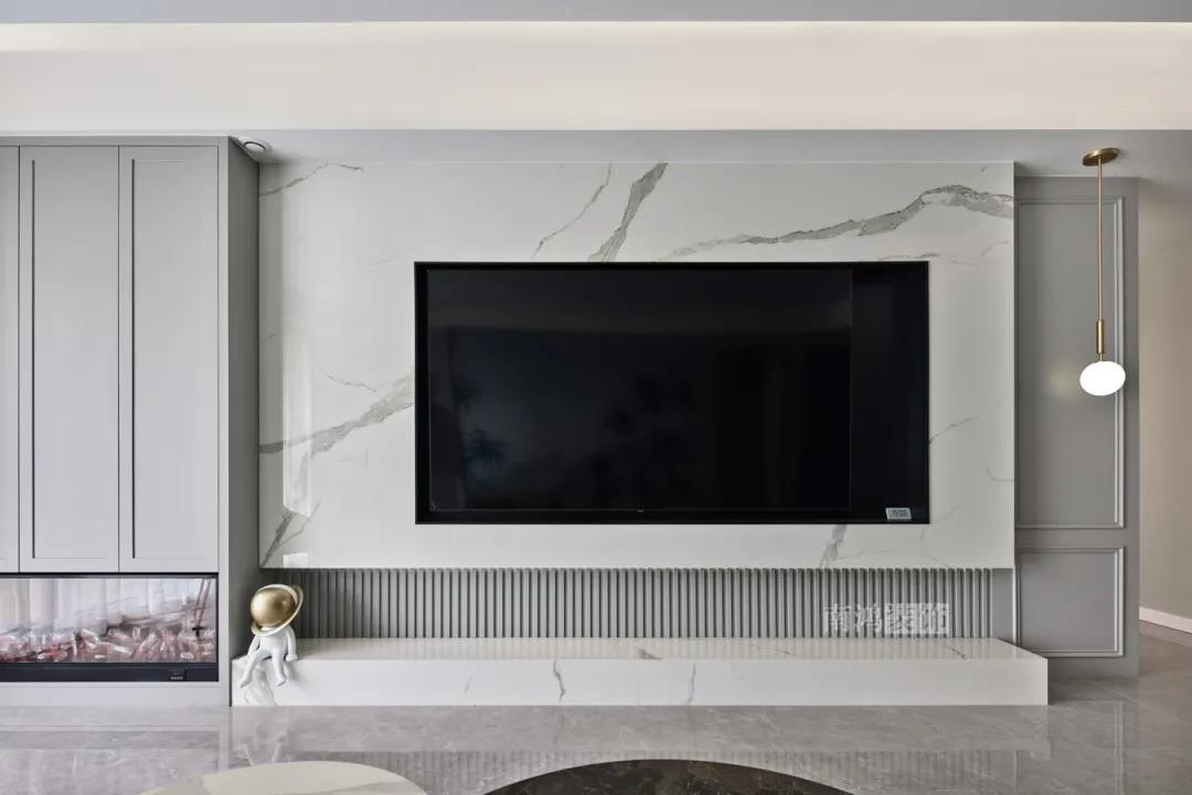 電視背景將美式的經典線條護墻與利落的大理石磚組合,沙發背景則做了木護墻隱形門處理,配以簡單干凈又不減細節的吊頂,既實現了兩種不同風格元素的結合,又能讓造型為居家功能服務。