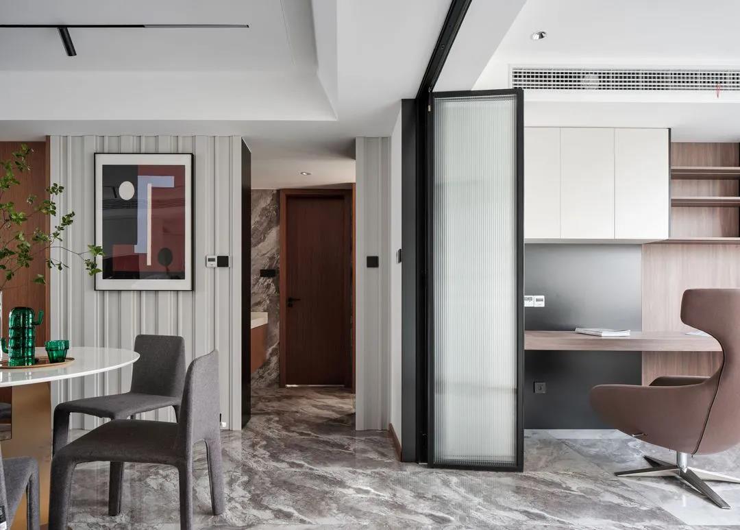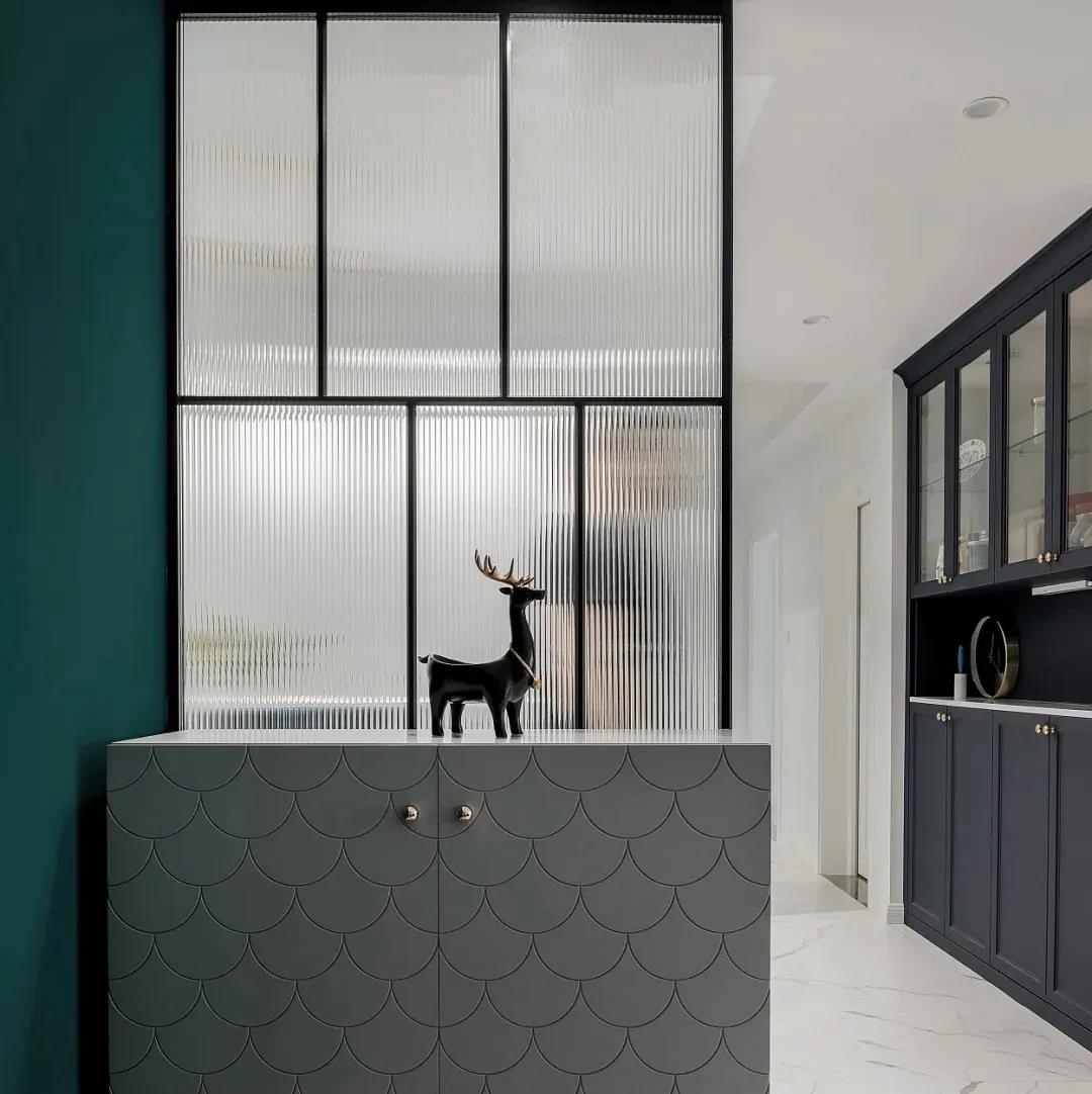 豎條紋壓花玻璃的“豎”,會(huì)比其他幾何線條更容易帶來(lái)“高”的心理暗示,且它作為隔斷或者移門時(shí),會(huì)使空間看起來(lái)敞亮,實(shí)現(xiàn)各空間的和平相處。