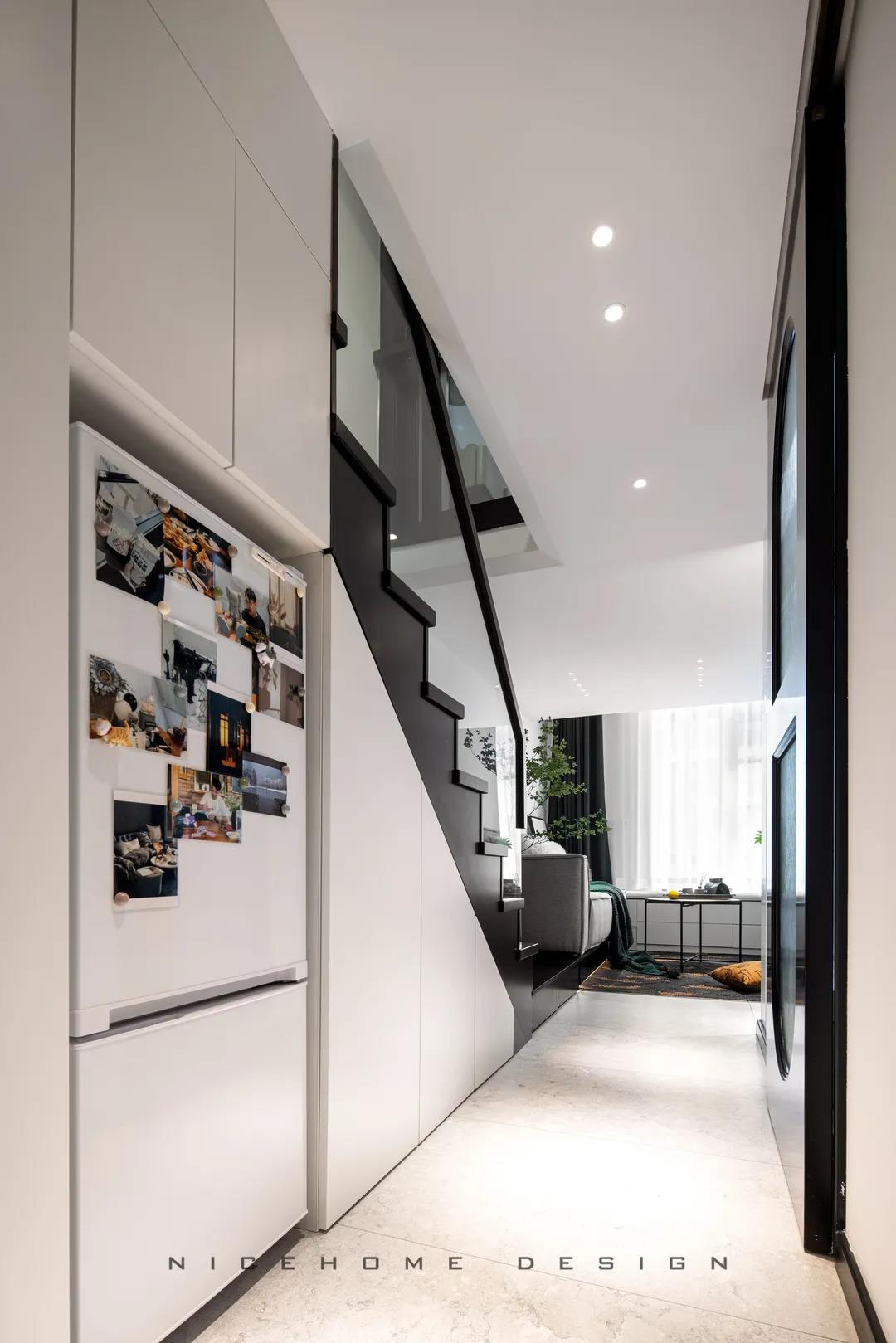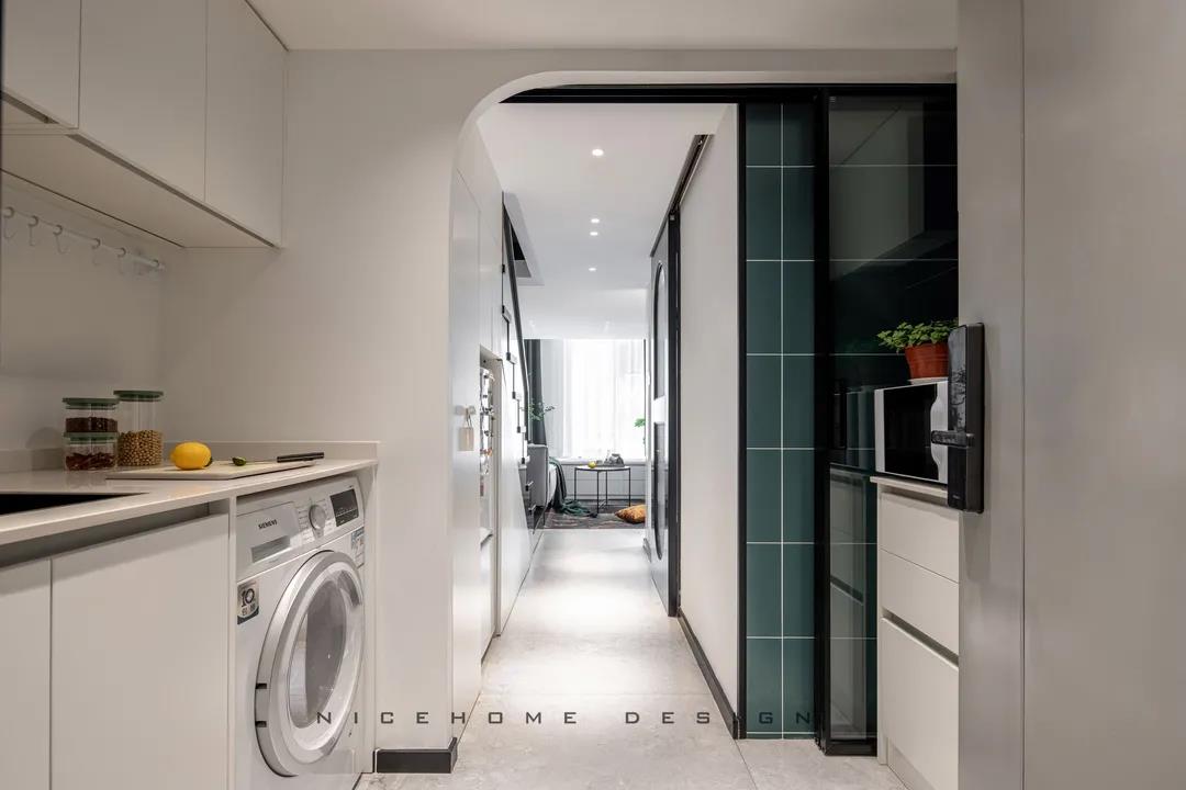 小戶型因為面積有限,所以角角落落的地方都不能浪費。白色的收納柜包容所有雜物,體積較大的冰箱、洗衣機也都做了嵌入,過道的門洞則設計成半拱形,一系列小細節便能讓我們感知到主人對家的用心。