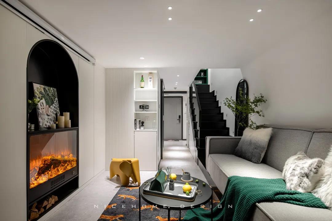 不到50方的屋子,還是設計出了三房的功能,以滿足業主的加班需求及父母偶爾小住的客臥需求。底樓只有一扇窗戶沒有陽臺,所以設計師在臨窗位置做了挑空,最大化保留居室采光。