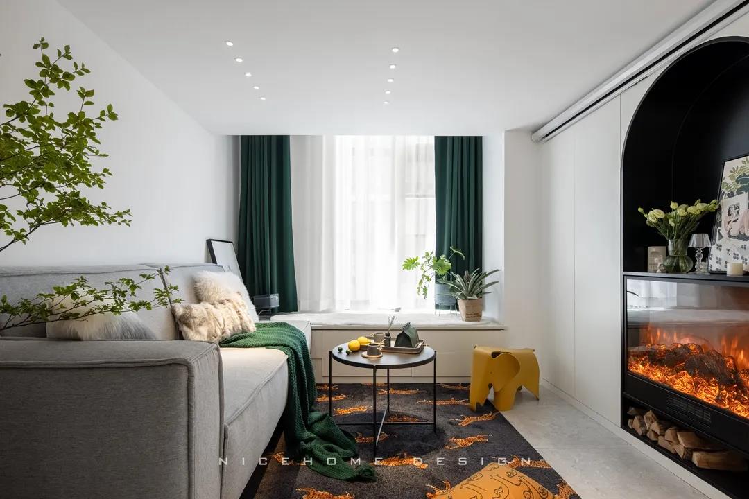 墨綠色的點綴優雅不失活力,壁爐內跳動的火焰帶來家的溫度。小象形狀的椅子、壁面的線條切割、清新的綠植花卉,還有風格統一的沙發茶幾和地毯,都是室內的點睛之筆。