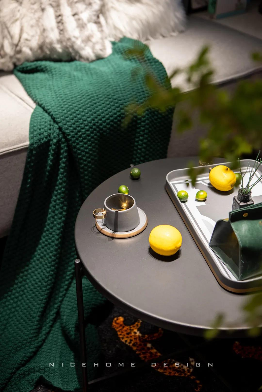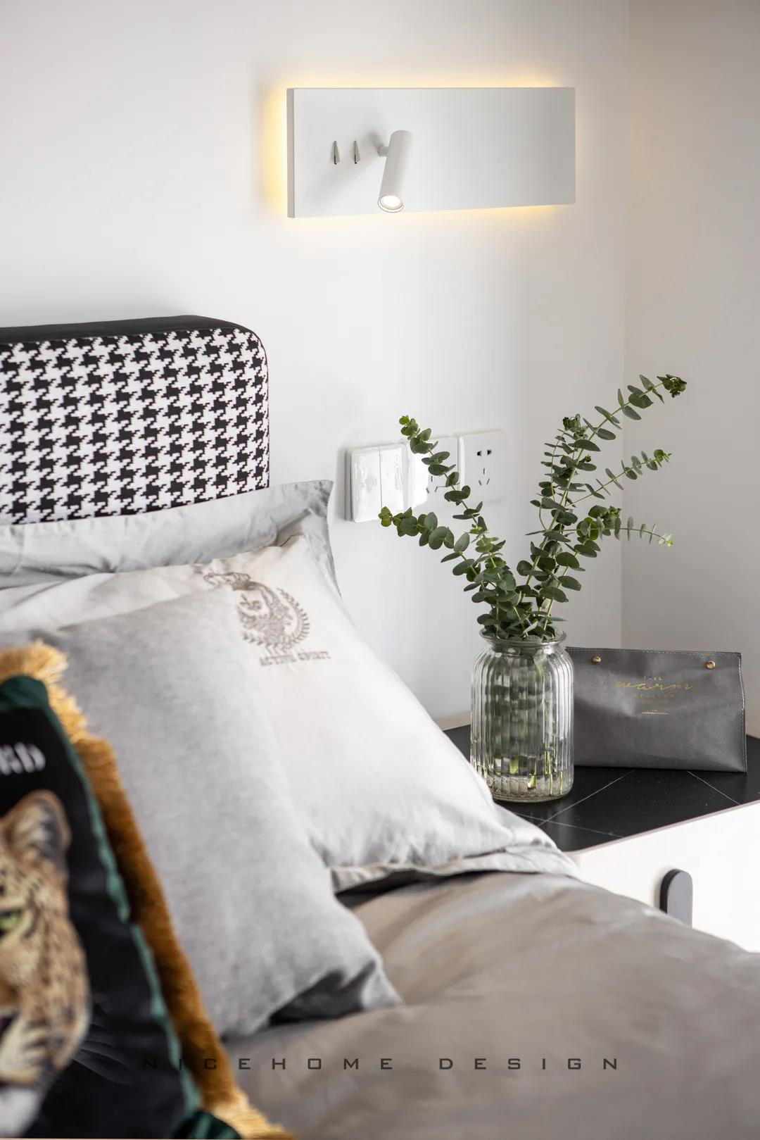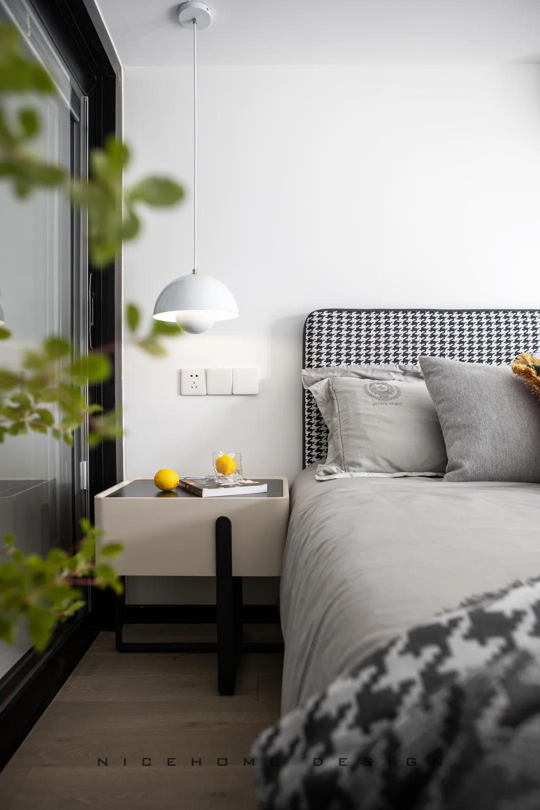 臥室背景留白,低飽和色彩創造舒眠環境,千鳥格紋自帶經典美感,光源都被設置得“小心翼翼”,仿佛不忍打擾這里的寧靜。