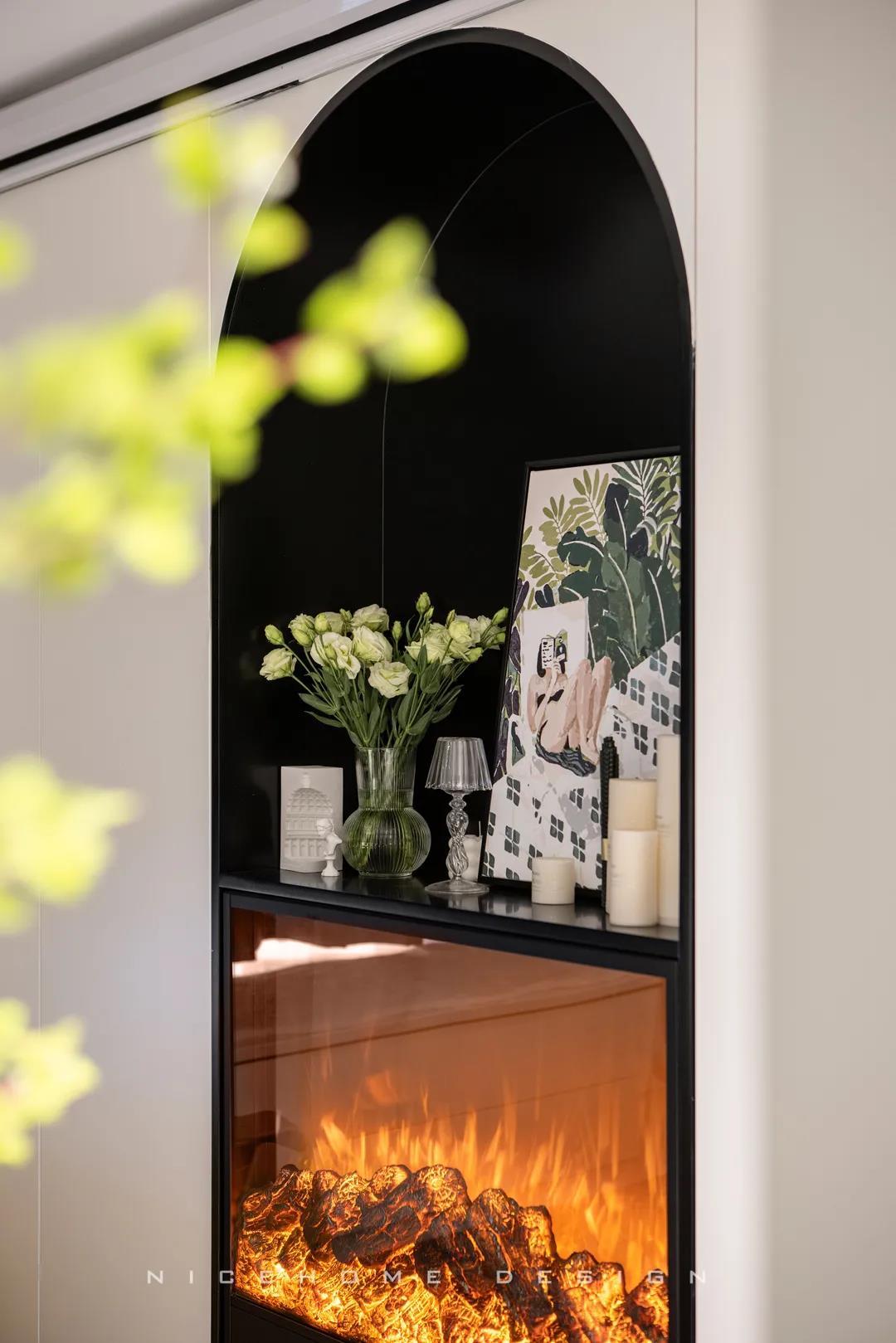 公共區域比較狹小,又得兼顧到收納,便以柜體+壁爐的形式做背景,投影幕布取代電視機,讓美學與實用功能盡可能達到平衡。