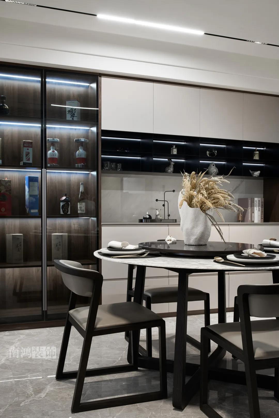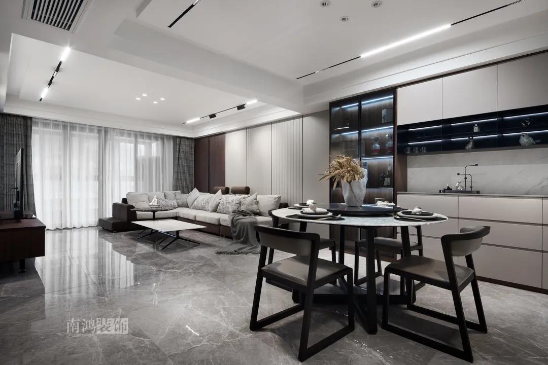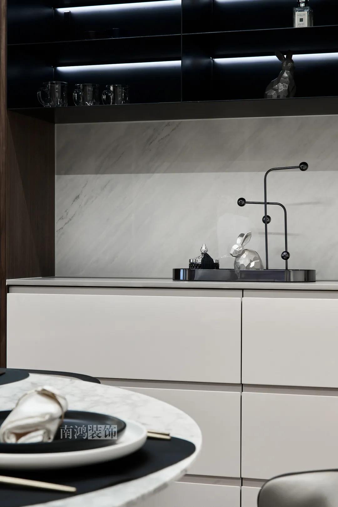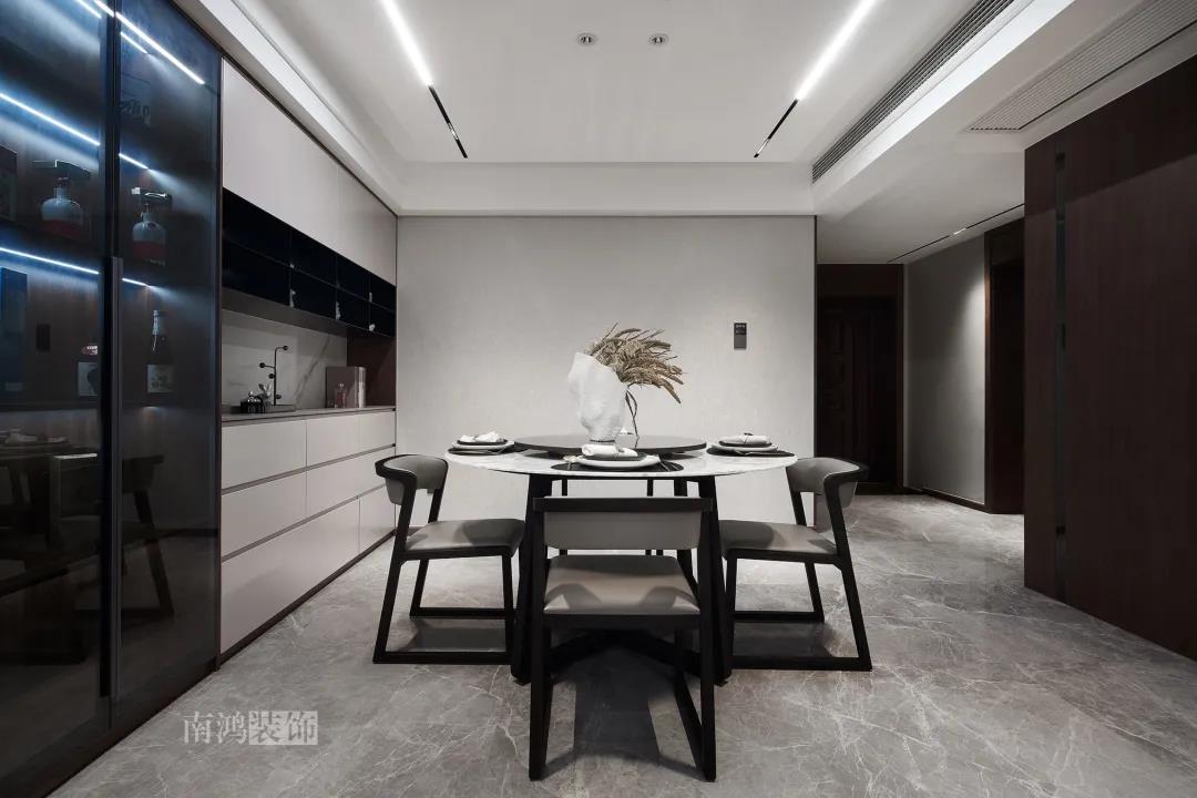 本案是一套老房翻新的項(xiàng)目,業(yè)主是咱們南鴻的老客戶了,這次找到我們把這套房子重新裝修,將來可以做女兒的婚房。 作品配色上是經(jīng)典的黑白灰,家具有特意選用業(yè)主喜愛的黑胡桃木材質(zhì),黑胡桃木家具顏色深沉,紋理豐富明晰,將整體家居氛圍襯得是更有質(zhì)感。 玄關(guān) ENTRANCE 穩(wěn)重有序的設(shè)計(jì)基調(diào),從玄關(guān)開始。隱形門將通往衛(wèi)生間的入口完全隱藏,使視覺效果得到高度統(tǒng)一,正前方與右側(cè)的柜子起到玄關(guān)收納的作用。 敲墻后打造出的雙面柜體結(jié)構(gòu),厚重的體塊既能做區(qū)域間的有效分隔,又是以一種深沉的姿態(tài),喚醒人內(nèi)心的安寧與平靜。 客廳 LIVING ROOM 客廳用材以石材與黑胡桃木為主,頂面的軌道燈可延伸視線,軟硬材質(zhì)的恰當(dāng)配比,冷暖色調(diào)的合理調(diào)配,讓空間的每一個(gè)節(jié)點(diǎn)都有著舒適感的存在。 豐富的紋理與材質(zhì)變化之中,藏著有跡可循的規(guī)律,彼此呼應(yīng),以現(xiàn)代主義美學(xué)手法所搭配出的室內(nèi)陳設(shè),帶來飽滿的美感。 客餐廳區(qū)域原本就十分寬敞,空間相互自由流通,大氣的感受撲面而來。 餐廳 DINING ROOM 餐食空間自成一處,含蓄的色調(diào)端莊穩(wěn)重,墻面留白保持了簡練質(zhì)感。木質(zhì)元素調(diào)和石材與玻璃的冷冽,光影交錯(cuò)間切割出虛實(shí)之境。 公共區(qū)域的收納在居住日常中相當(dāng)重要,合理的配置和分區(qū),更利于保持這里的長期整潔,像餐廳做了長排的餐邊柜與一組酒柜,看著就清爽利落。 廚房 KITCHEN 廚房采光不是特別好,所以用了白色的櫥柜和淺色的瓷磚來呈現(xiàn)明凈的空間感,黑色臺(tái)面是它們的最佳拍檔。 臥室 BEDROOM 公共空間的元素都被延續(xù)到了這里,格柵、硬包、墻布...光源有層次的排布,讓空間有了無比溫馨的格調(diào)。 屋子的收納重心被放到了次臥,榻榻米除了能承擔(dān)儲(chǔ)藏功能之外,也是平時(shí)一個(gè)好的休閑去處。 衛(wèi)生間 BATHROOM 衛(wèi)生間以白色為基調(diào),體現(xiàn)出空間的干凈整潔,自帶漸變紋理的瓷磚,起到華麗的視覺效果,整體營造出明亮、優(yōu)雅的感覺。