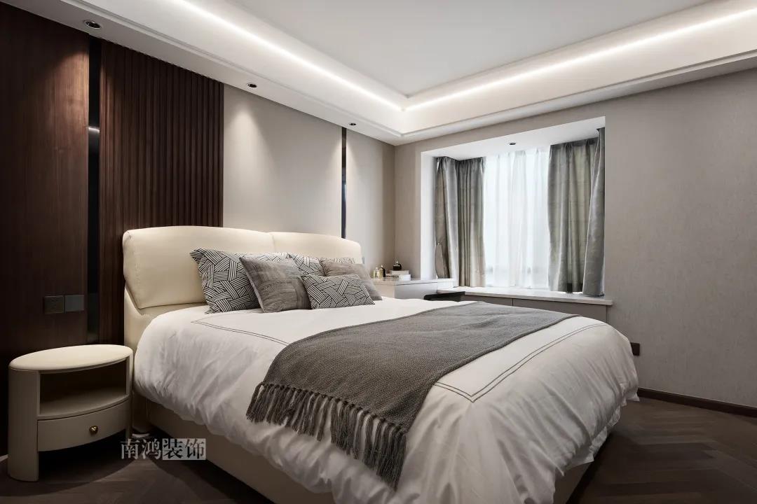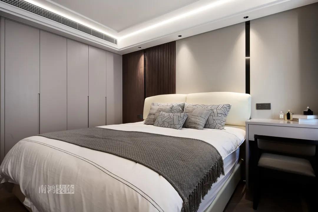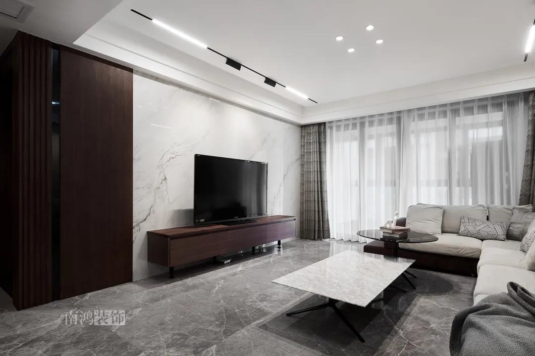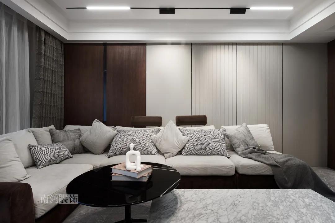 本案是一套老房翻新的項(xiàng)目,業(yè)主是咱們南鴻的老客戶了,這次找到我們把這套房子重新裝修,將來可以做女兒的婚房。 作品配色上是經(jīng)典的黑白灰,家具有特意選用業(yè)主喜愛的黑胡桃木材質(zhì),黑胡桃木家具顏色深沉,紋理豐富明晰,將整體家居氛圍襯得是更有質(zhì)感。 玄關(guān) ENTRANCE 穩(wěn)重有序的設(shè)計(jì)基調(diào),從玄關(guān)開始。隱形門將通往衛(wèi)生間的入口完全隱藏,使視覺效果得到高度統(tǒng)一,正前方與右側(cè)的柜子起到玄關(guān)收納的作用。 敲墻后打造出的雙面柜體結(jié)構(gòu),厚重的體塊既能做區(qū)域間的有效分隔,又是以一種深沉的姿態(tài),喚醒人內(nèi)心的安寧與平靜。 客廳 LIVING ROOM 客廳用材以石材與黑胡桃木為主,頂面的軌道燈可延伸視線,軟硬材質(zhì)的恰當(dāng)配比,冷暖色調(diào)的合理調(diào)配,讓空間的每一個(gè)節(jié)點(diǎn)都有著舒適感的存在。 豐富的紋理與材質(zhì)變化之中,藏著有跡可循的規(guī)律,彼此呼應(yīng),以現(xiàn)代主義美學(xué)手法所搭配出的室內(nèi)陳設(shè),帶來飽滿的美感。 客餐廳區(qū)域原本就十分寬敞,空間相互自由流通,大氣的感受撲面而來。 餐廳 DINING ROOM 餐食空間自成一處,含蓄的色調(diào)端莊穩(wěn)重,墻面留白保持了簡練質(zhì)感。木質(zhì)元素調(diào)和石材與玻璃的冷冽,光影交錯(cuò)間切割出虛實(shí)之境。 公共區(qū)域的收納在居住日常中相當(dāng)重要,合理的配置和分區(qū),更利于保持這里的長期整潔,像餐廳做了長排的餐邊柜與一組酒柜,看著就清爽利落。 廚房 KITCHEN 廚房采光不是特別好,所以用了白色的櫥柜和淺色的瓷磚來呈現(xiàn)明凈的空間感,黑色臺(tái)面是它們的最佳拍檔。 臥室 BEDROOM 公共空間的元素都被延續(xù)到了這里,格柵、硬包、墻布...光源有層次的排布,讓空間有了無比溫馨的格調(diào)。 屋子的收納重心被放到了次臥,榻榻米除了能承擔(dān)儲(chǔ)藏功能之外,也是平時(shí)一個(gè)好的休閑去處。 衛(wèi)生間 BATHROOM 衛(wèi)生間以白色為基調(diào),體現(xiàn)出空間的干凈整潔,自帶漸變紋理的瓷磚,起到華麗的視覺效果,整體營造出明亮、優(yōu)雅的感覺。