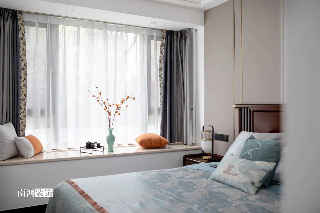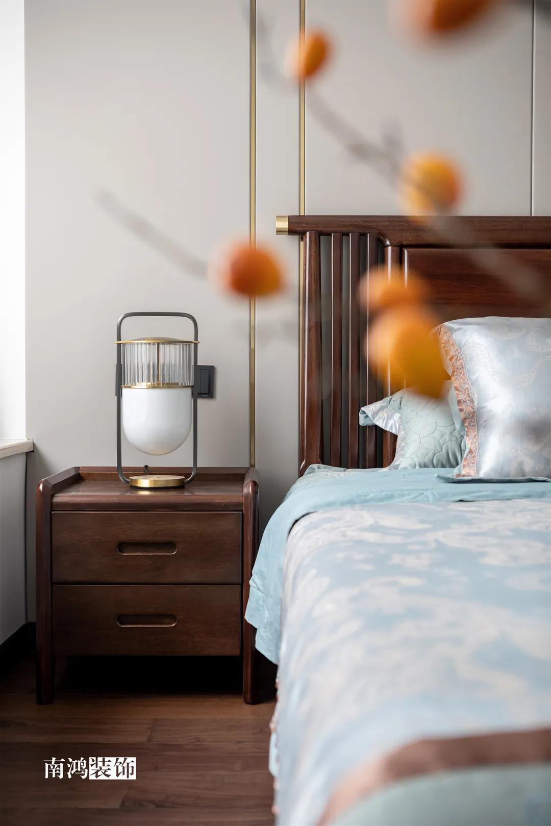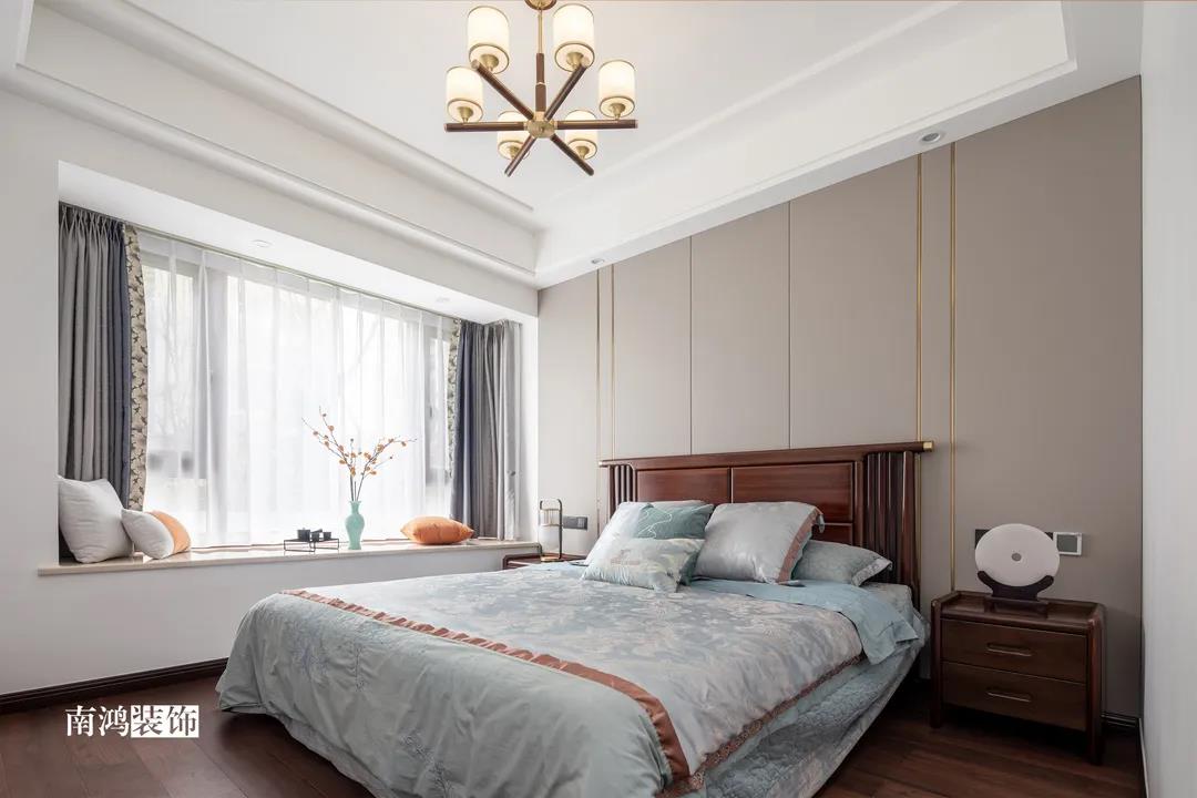 臥室提取新中式的大氣格調(diào),又與現(xiàn)代流行方式相碰撞,讓空間去除繁雜、告別沉悶。硬包背景墻嵌入亮色金屬條,創(chuàng)造寧?kù)o而不失精致的氛圍。