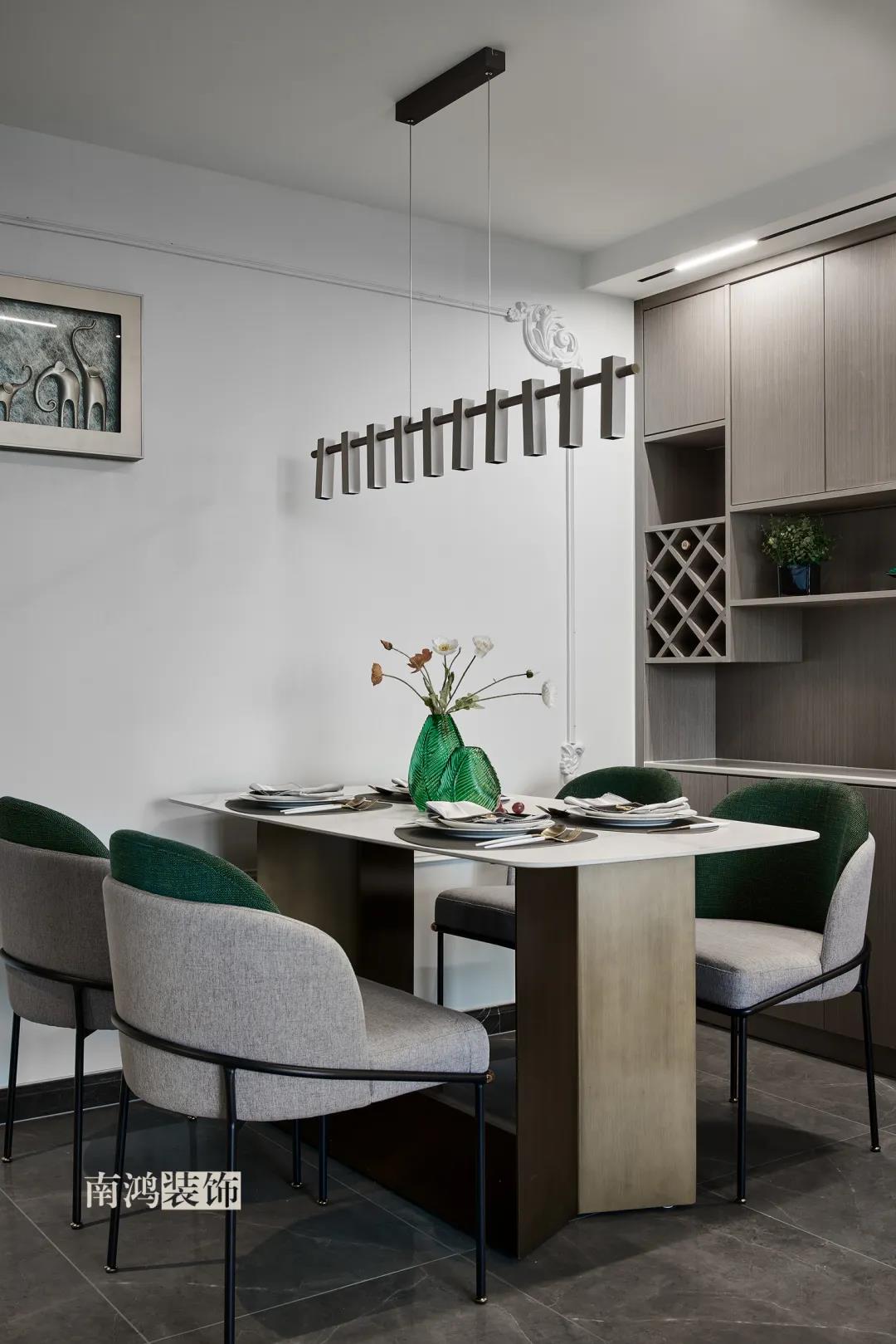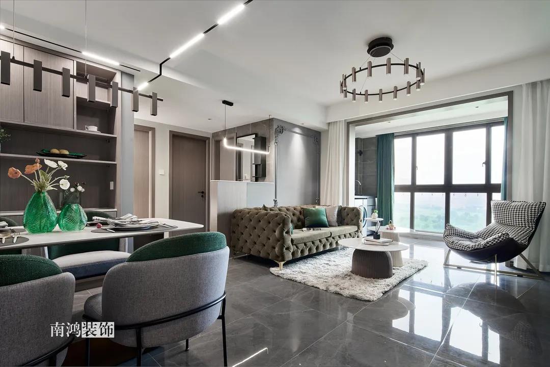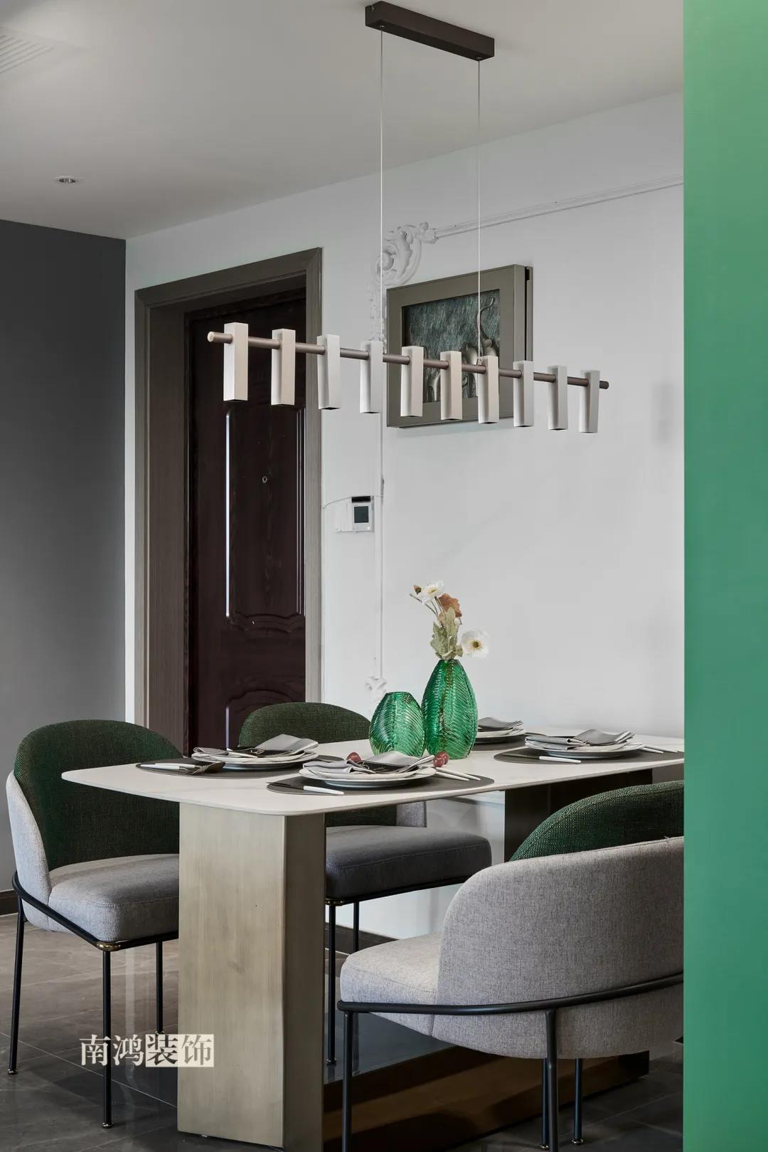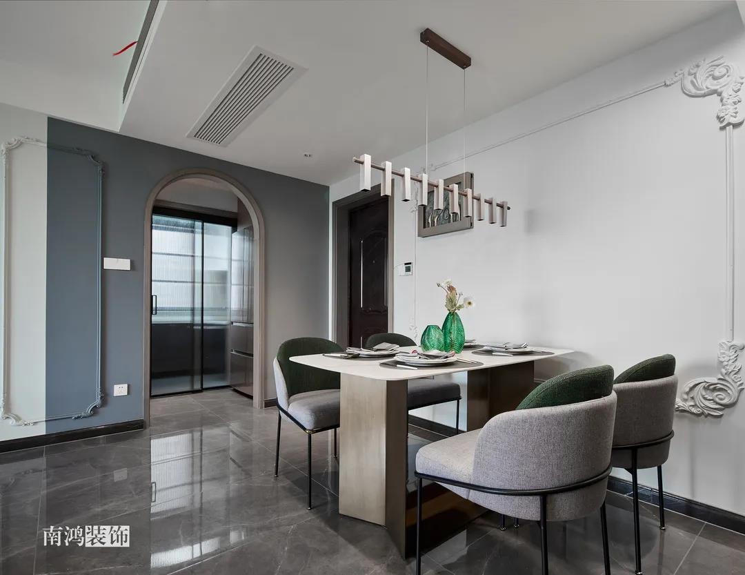 【項目·信息】 地址 / 世貿(mào)西西湖 戶型 / 三室兩廳 面積 / 91㎡ 風格 / 現(xiàn)代法式 設計施工 / 浙江南鴻裝飾 本案為91㎡現(xiàn)代法式風格作品。現(xiàn)代法式摒棄傳統(tǒng)法式繁復、冗雜的裝飾造型與甜膩的色澤,通過淡雅的色調(diào),簡潔的幾何線條和典雅時尚的陳設軟裝,來打造更符合現(xiàn)代人喜好的生活空間。 業(yè)主夫妻倆,一位是性格沉悶的工程男,一位是熱情開朗的設計女,彼此志趣相投,性格互補,優(yōu)雅的法式,給這個甜蜜小家庭增添了更多美妙情趣~ ▲原始結(jié)構圖 ▲平面設計圖 ①衛(wèi)生間做干濕分離。 ②兒童房的門洞方向更改,完整電視背景墻效果。 ③主臥和次臥交換位置,次臥陽臺打通。 ④縮小主衛(wèi)面積,墻體后退得以嵌入一個大衣柜。 入戶門進來即見餐廳。戶型面積不大,公區(qū)域都盡量打開讓視野更開闊。 硬裝整體簡潔,墻面可見石膏線花紋裝飾,借此強化一定法式空間意象。餐桌椅、吊燈的造型選擇也都偏現(xiàn)代,空間中奢與簡的分寸把握得恰到好處。 綠色作為本案的點綴色,可以說貫穿了幾乎各個分區(qū)之中,鮮活的生命力讓人過目難忘。 客餐廳一體式設計是小戶型的常見選擇,也更符合現(xiàn)代人的生活習慣。灰白主色保持整體低調(diào),局部墻面以飽和度高的綠色乳膠漆涂刷,空間被提亮不少。 客廳采光良好,沙發(fā)背景墻連接干區(qū)的位置做一個小的半高柜,提升空間利用率。軟裝家具布置則用簡潔的設計手法將法式的古典優(yōu)雅和現(xiàn)代的簡約時尚相結(jié)合,使得空間既有休閑感受,又不乏藝術氣息。 經(jīng)過設計調(diào)整,電視背景墻的效果更加完整,深淺色調(diào)做左右兩塊分界,以石膏線裝飾則更顯精致。 拱形門洞也被應用在這里,作為歷史悠遠的一種經(jīng)典建筑元素,本身就很契合各種帶古典意味的家居風格。 廚房以長虹玻璃門隔絕油煙,保證內(nèi)部的私密性,也實現(xiàn)了采光的通透感。冰箱被移至過道,釋放內(nèi)部更多空間。 廚房采用U型布局,動線流暢,烹飪區(qū)、操作臺和洗滌區(qū)都有各自獨立的空間,互不打擾。 主臥,青草綠墻布做背景裝飾,留白保持簡約調(diào)性,一幅婚紗照訴說著夫妻二人簡簡單單、明明白白的甜蜜愛情故事。 光源除主燈外,床頭兩側(cè)各有布置,一邊長臂燈一邊吊燈的不對稱設計,讓臥室空間顯得更加有趣,金屬材質(zhì)呈現(xiàn)輕奢美感。 長輩房的背景、色彩選擇需要貼合老人的喜好,選用橙色主色,帶來如陽光般的燦爛、溫暖感受。 夫妻二人目前還沒有孩子,這個房間預備做以后的兒童房,布置相對簡單,方便將來調(diào)整。 衛(wèi)生間將干濕區(qū)域分離,洗漱臺盆柜、壁柜與旁邊打造出的半高柜體可將瓶瓶罐罐都收入其中,保證視覺上的清爽。