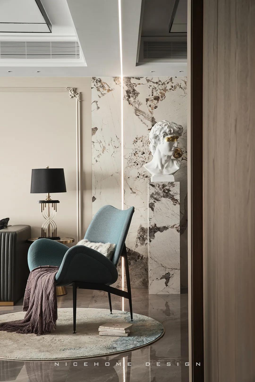 【項目·信息】 地址 | 盛世天城 城市 | 中國 寧波 戶型 | 四室兩廳 面積 | 185㎡ 風(fēng)格 | 現(xiàn)代輕奢 設(shè)計施工 | 浙江南鴻裝飾 主要用材 | 格萊美瓷磚、邁菲樂地板、杜拉維特衛(wèi)浴、洛華隆櫥柜、美萃家具、南鴻美家軟裝等 關(guān)于本案 About The Design 今天為大家?guī)硪惶赚F(xiàn)代輕奢風(fēng)格新作,男女主人均為小學(xué)老師,女兒十歲,常住人口為三名。他們希望家首先是要實用,有盡可能多的收納空間,其次有較高審美需求,在空間表現(xiàn)上希望溫馨舒適又不失藝術(shù)格調(diào)。 溫和與沉靜是這個家的主調(diào),開闊的空間擁有著優(yōu)越的采光與視野。穩(wěn)重的大地色配合大理石、金屬、皮革、棉麻等多種材質(zhì),極富力量和層次。 空間布局張弛有度,木飾面溫潤的色澤將暖意帶入其中,以“靜”為名的藝術(shù)妙筆記錄下生活的美好,打造一個生活美學(xué)與藝術(shù)氛圍相互平衡的居住領(lǐng)域。 關(guān)于戶型 About The House Type ▲原始結(jié)構(gòu)圖 ▲平面設(shè)計圖 01. 客廳 Living Room 客廳是一個采光良好的方正大空間,明朗、大氣,穩(wěn)重的大地色烘托溫和而親切的人文氣質(zhì)。 頂面黑色不銹鋼和磁吸軌道燈形成線條延伸感,增加了視覺層次。沙發(fā)背景植入小法式護墻混搭,與大衛(wèi)雕塑組合,為空間注入靈動與格調(diào)。自過道口頂端特意拉出一道折線燈帶,勾勒個性的藝術(shù)氣場。 壁掛電視與收納背景合而為一,外觀利落整潔。儲物柜精準分配開閉比例,收放自如之間,穩(wěn)妥了實用機能,協(xié)調(diào)了日常節(jié)奏,讓設(shè)計感恰到好處。 空間平鋪的溫厚色澤以穩(wěn)重低調(diào)的問候與居者發(fā)生情感碰撞,含蓄內(nèi)斂兼具東方美學(xué)韻味,一呼一吸之間將溫度與關(guān)懷深入人心。 陽臺處設(shè)計品茶區(qū),清冽的茶香伴著溫煦日光,縈繞此間的只有言笑晏晏的自在感受... 02. 餐廳 Dining Room 餐廳與客廳以過道為界,餐桌椅均線條簡練卻不乏精致細節(jié),一側(cè)大體量餐邊柜用于收納諸多雜物,空出的操作臺日后可擺放一些小家電,方便制作簡餐。 03. 廚房 Kitchen 廚房櫥柜選擇與公區(qū)域同種溫和色系,搭配灰色墻地磚,視覺得到統(tǒng)一,空間更顯明亮潔凈。 04. 過道 Corridor 過道懸一幅尺寸適中的掛畫,詩意的綠色剛好與背景墻大理石肆意灑脫的紋理相映成趣,賦予空間別樣的張力。 05. 臥室 Bedroom 主臥之內(nèi)所流動的情感,溫暖而真誠。藝術(shù)感與生活感交融,營造出親切而閑適的氛圍,分分鐘便能撫平主人一天的疲憊。 床尾斗柜延伸出梳妝臺區(qū)域,綠植、畫作、小雕塑,共同圍構(gòu)出一角小小的藝術(shù)天地。 客臥的氣質(zhì)同樣雅致非凡,光線流連入內(nèi),盈盈散發(fā)著溫潤平靜的質(zhì)感。右上角的個性掛飾就像是懸浮在半空中的月亮,讓夜晚充滿浪漫的情調(diào)。 06. 兒童房 Children's Room 以馬卡龍粉為主色調(diào)的女兒房,睡眠區(qū)、學(xué)習(xí)區(qū)、休閑區(qū)、收納區(qū)被有序安置,保障孩子能夠擁有一個完善的成長環(huán)境。房間內(nèi)也有許多孩子喜愛的童趣元素,看,墻上這只頭戴小花的兔兔是不是就特別地可愛呢~ 自然親膚的面料給予孩子最大的舒適感受。 07. 書房 Study 書房,沒有任何多余的裝飾,書桌椅+大書柜的配置便已足夠日常的辦公、學(xué)習(xí)使用,轉(zhuǎn)角飄窗也被妥善利用起來,作為閑適一角。 08. 衛(wèi)生間 Toilet 衛(wèi)浴干濕分離,懸空式設(shè)計的原木儲物柜與臺盆柜足以滿足收納之需,視覺上也更加輕盈不添負擔(dān),保留一份簡單純粹。