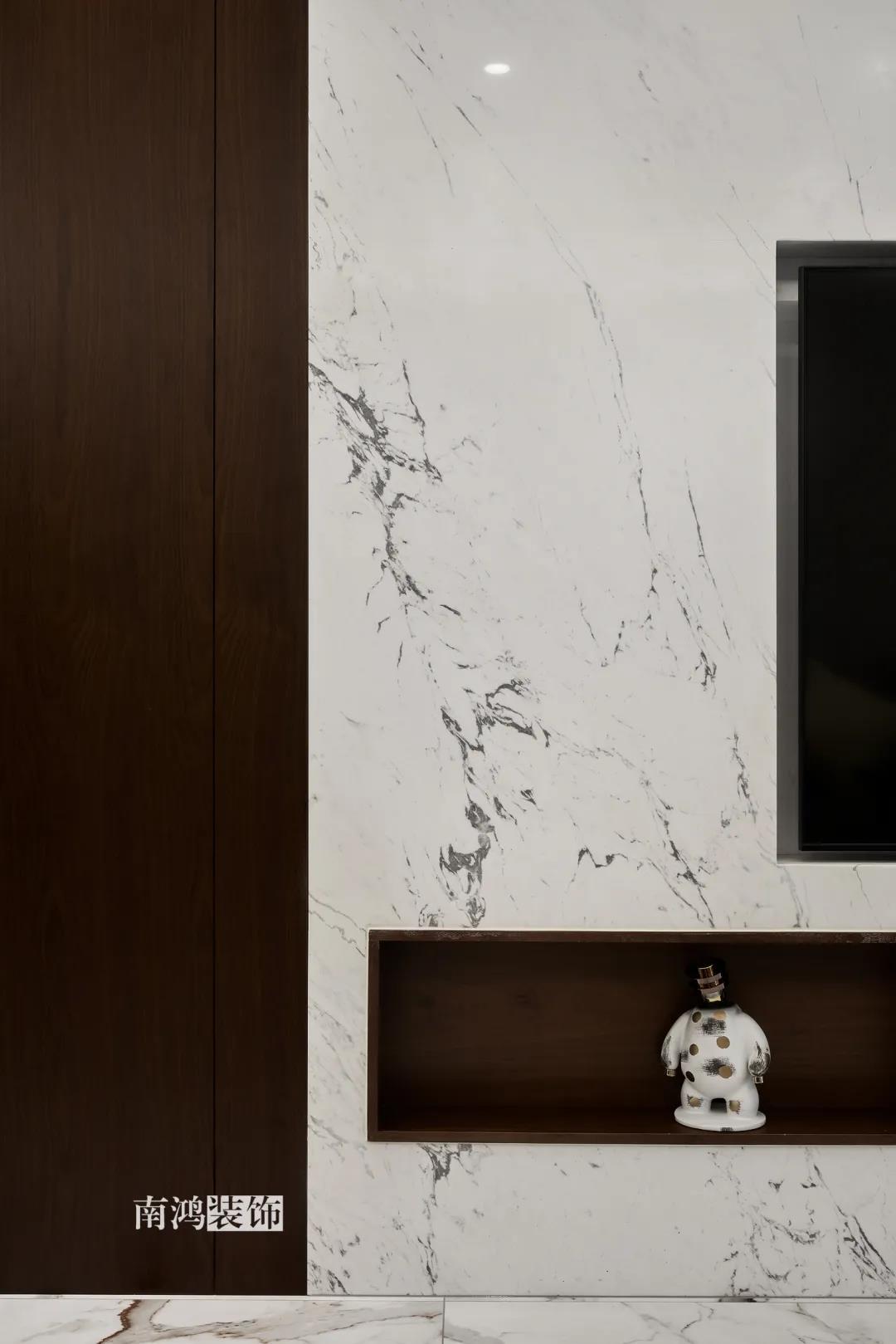 電視機嵌入大理石背景,墻面紋理與地呼應(yīng),下開收納格取代傳統(tǒng)電視柜的位置,立面干凈,層次更在一深一淺中凸顯。