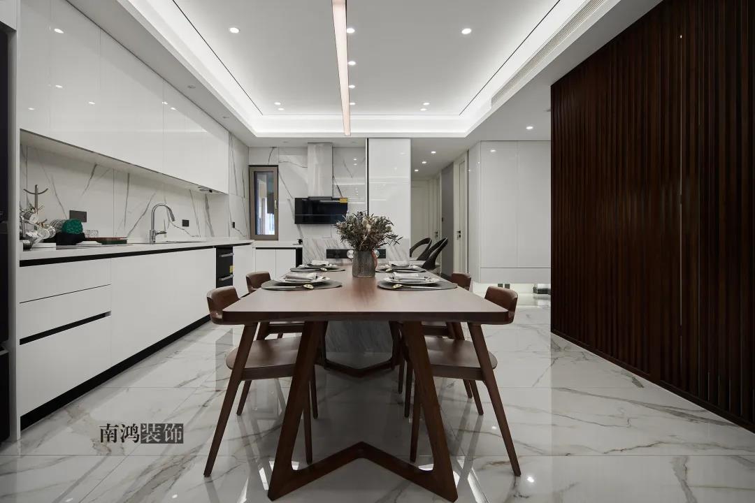 開放式布局將廚房和餐廳融為一體,潔白柜體把嵌入式電器隱含其中,寬大的臺面足以滿足日常烹飪需求,環(huán)形的動線則可以讓人穿梭其中行走自如。