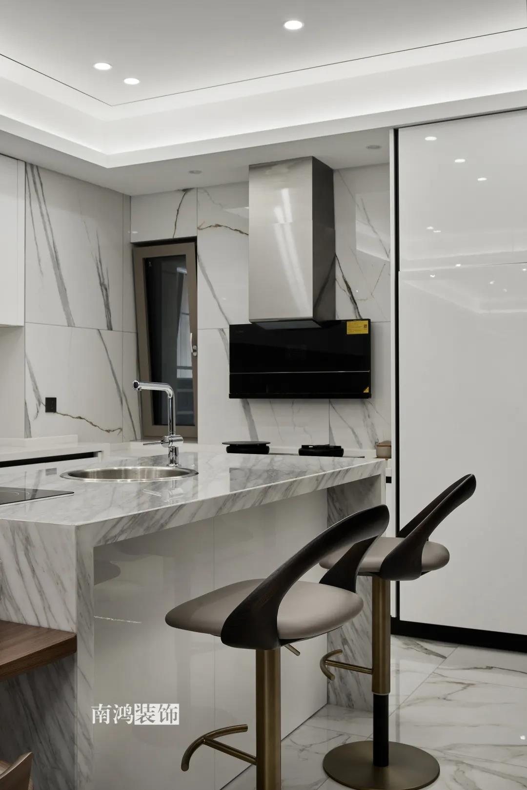 既可以擴充廚房操作臺面,又能當吧臺使用的島臺,和餐桌結(jié)合在一起,大大增加了使用頻率,搭配上款式輕盈的吧臺凳,毫無疑問是餐廚區(qū)的顏值與實力擔當。