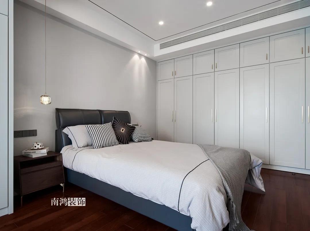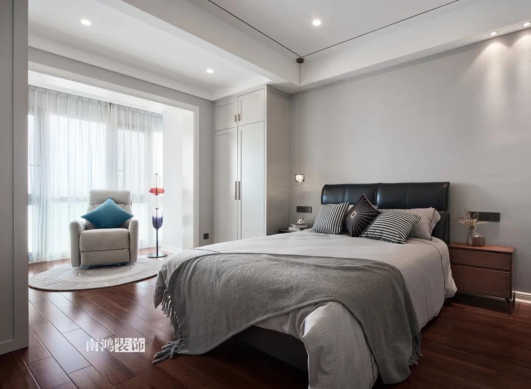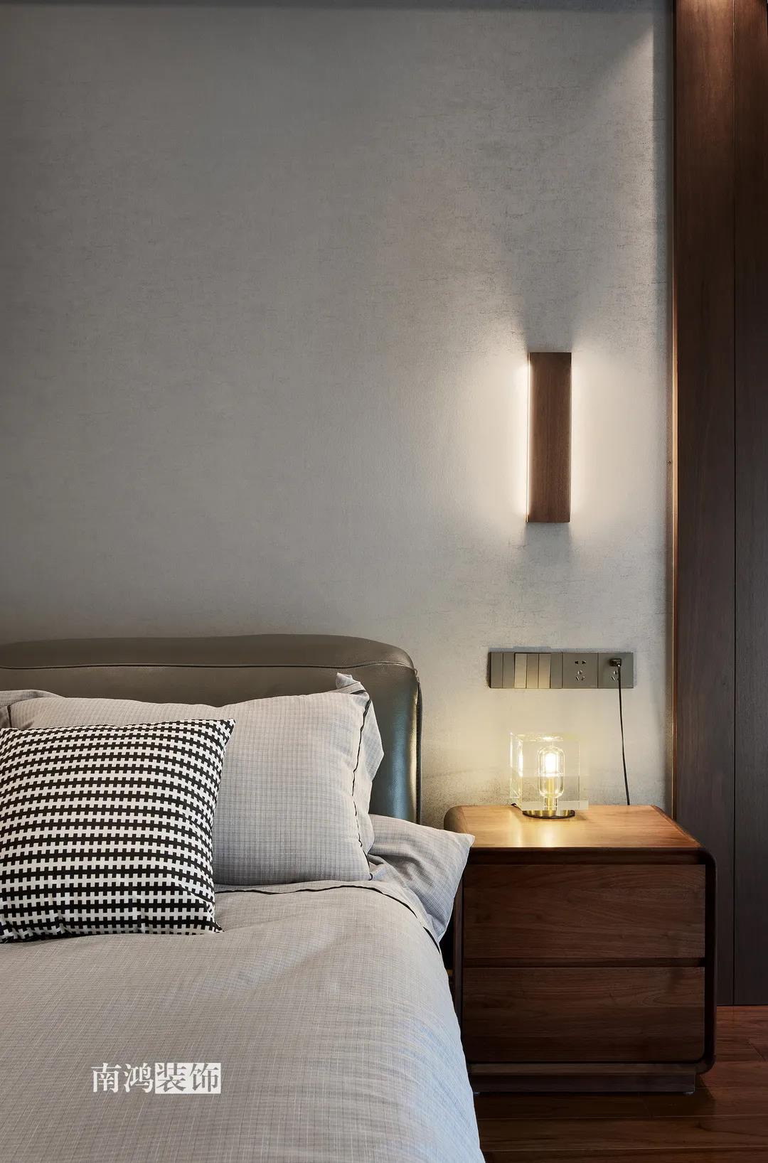 主臥背景墻以灰色墻布和木飾面結(jié)合,細膩紋理展現(xiàn)有機的溫暖、純凈,燈光被有序在墻頂面安置,讓人倍感安神,又不失高雅格調(diào)。